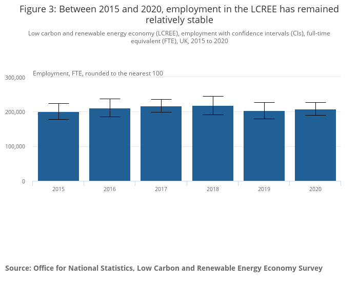 Employment in the UK LCREE was estimated to be 207,800 full-time equivalent (FTE) in 2020, with no significant change since 2014.