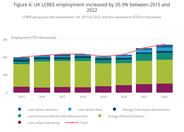 - UK LCREE employment also increased, by an estimated 8.0% between 2021 and 2022, from 252,300 to 272,400 full-time equivalents (FTEs).