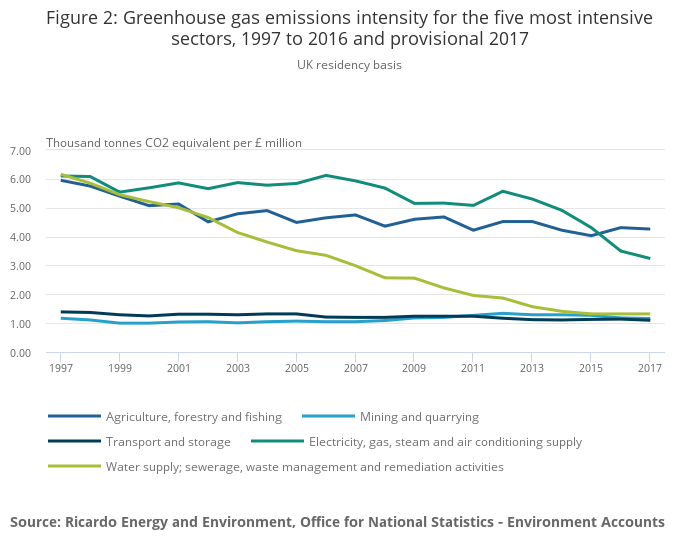 Figure 1 shows GHG intensity for the UK has reduced steadily over time. Since 1997, there has been a reduction of 52% (from 0.66 to 0.32 thousand tonnes of CO2 equivalent per £million of value added). This reduction is partly because some industries have become more efficient and reduced their greenhouse gas emissions in relation to their economic output. In addition, the UK has switched to a more service-based economy, with the importance of heavily-polluting industries decreasing since 1997.