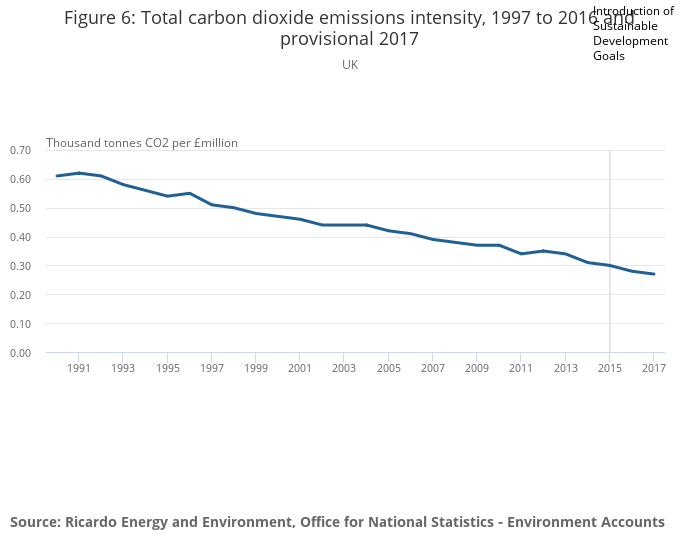 The Sustainable Development Goals (SDGs) Indicator 9.4.1 measures carbon dioxide emissions per unit of value added (or carbon dioxide emissions intensity); for the UK this has reduced by 48% since 1997 and 4% since 2016.