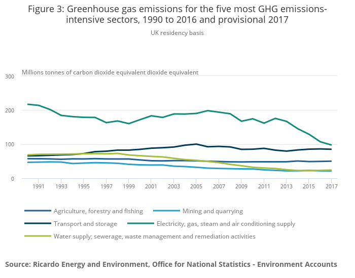 Estimates of figures on greenhouse gas emissions intensity are part of the UK Environmental Accounts, which are “satellite accounts” to the main UK National Accounts. The environmental accounts show how the environment contributes to the economy (for example, through the extraction of raw materials), the impact that the economy has on the environment (for example, energy consumption and air emissions) and how society responds to environmental issues (for example, through taxation and expenditure on environmental protection).