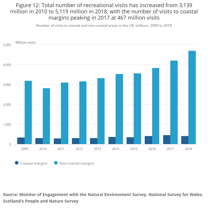 Download this chart Figure 12: Total number of recreational visits has increased from 3,139 million in 2010 to 5,119 million in 2018, with the number of visits to coastal margins peaking in 2017 at 467 million visits