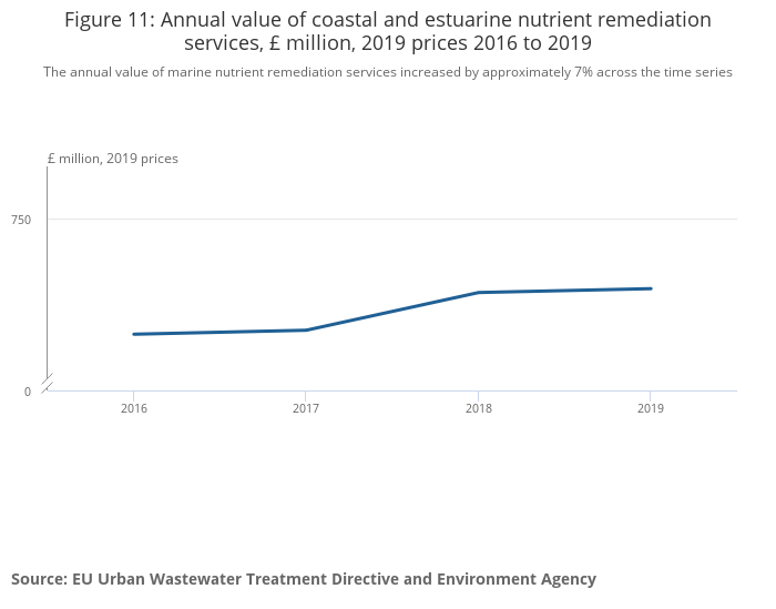 Coastal and estuarine nutrient remediation services for human input of Nitrogen and Phosphorous from urban wastewater rises across the time series shown. In 2016, the annual value of this regulating service was £640 million, and this increased to £683 million in 2019, assuming that the per kilogram cost of removing either Nitrogen or Phosphorous remains constant. The increase in annual value can be attributed to increased flows of wastewater and the quantity of nutrients flowing from them.