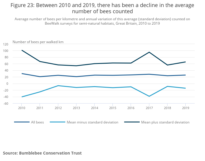 The bird indices on population numbers for woodland and water and wetlands plus butterflies of woodland and semi-natural habitats are in long term decline, with a negative impact on biodiversity. While there has also been a decline in the average numbers of bees counted in the last decade in semi-natural habitats, in the same period the average number of bats counted has increased.
