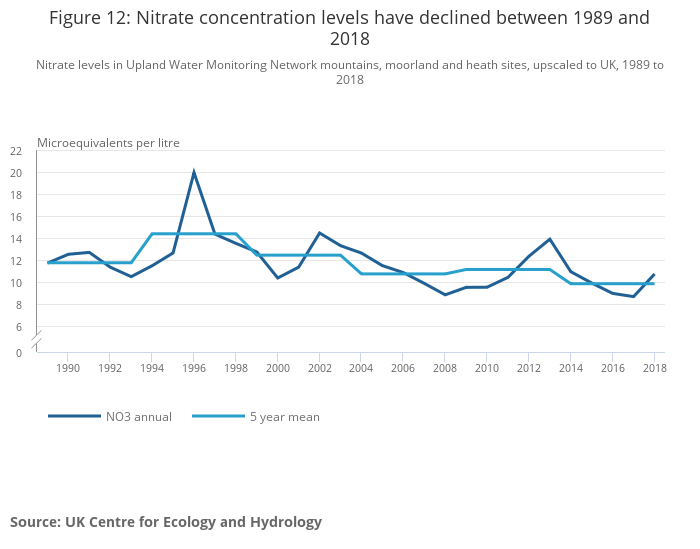 | Chemical state | Uplands water | Non-marine sulphate | Concentrations declined from 1996 to 2018 | Improving | Little change |