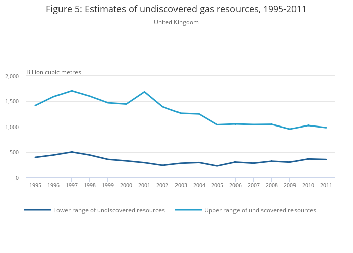 The upper range of the UK’s undiscovered gas resources decreased between 2010 and 2011 by 4.3% to 977.0 billion cubic metres. This was mainly due to re-assessment of existing prospects and leads in the Central North Sea.
