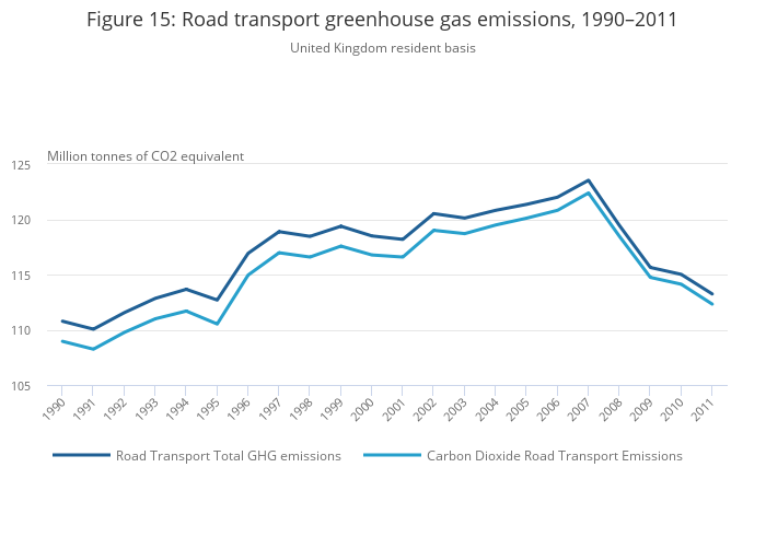Greenhouse gas emissions in 2011 were at their lowest level at 634.8 million tonnes of carbon dioxide equivalent, 21.3% lower than when the series began in 1990
