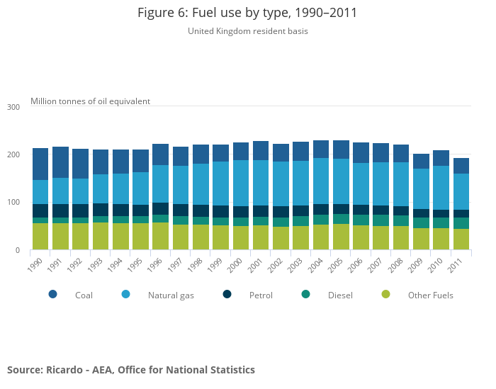 Fuel use of 193.6 Million tonnes of oil equivalent (Mtoe) in 2011 is the lowest since the series began in 1990. In 2011 fuel use was 9.3% lower than in 1990 and 7.7% lower than in 2010