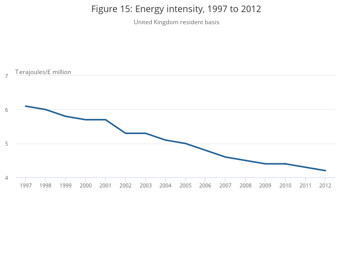 Greenhouse gas emissions intensity was 37.7% lower in 2012 (0.38 thousand tonnes of CO2e per £ million) compared with 1997 (0.61 thousand tonnes of CO2e per £ million)