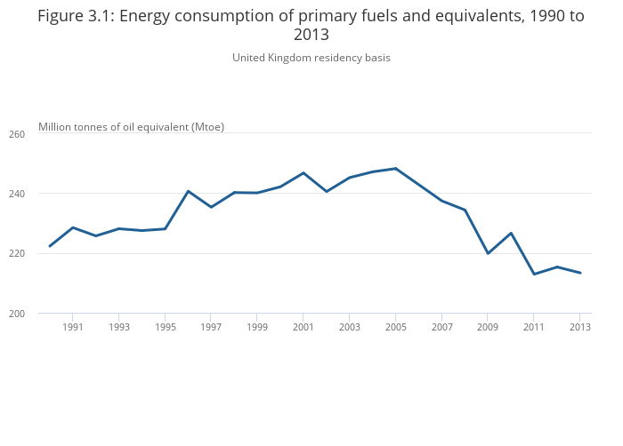 Total energy consumption of primary fuels and equivalent fell 0.9% between 2012 and 2013 to 213.3 Million tonnes of oil equivalent (Mtoe) (Figure 3.1). The fall is in line with the overall downward trend since 2005, which has seen total energy consumption falling 14.0%. Despite the fall, energy consumption in 2013 was still 0.4 Mtoe higher than in 2011, the lowest point in the series. In 2011 however, average annual air temperature was at its highest level since 2006, and 0.9 degrees Celsius warmer than 2013.