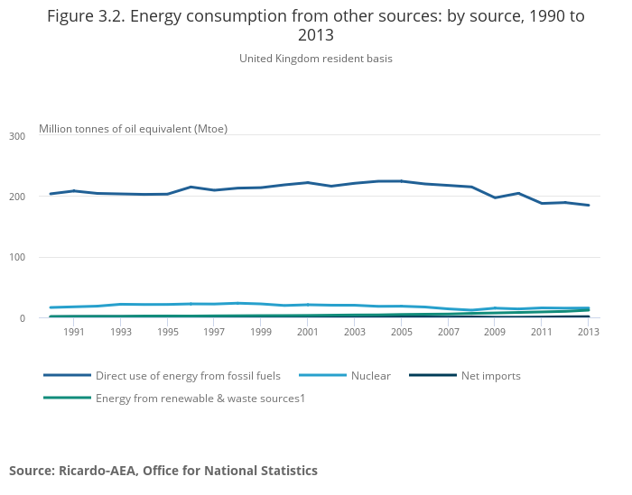 Although fossil fuels remained the main source of energy for consumption, other sources (including nuclear, net imports and renewable and waste) became increasingly important. Total energy consumption from other sources increased between 2012 and 2013 by 9.3% to 28.6 Mtoe. Nuclear remained the second largest source of energy in 2013, increasing marginally by 1.6% to 15.4 Mtoe between 2012 and 2013. Energy consumption from imports also increased, from 1.0 Mtoe to 1.2 Mtoe. Consumption from renewable and waste sources increased 19.9% to 11.9 Mtoe between 2012 and 2013.