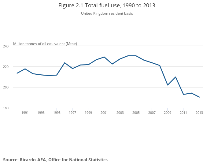 Total fuel use fell between 2012 and 2013 by 2.0% to 190.3 Million tonnes of oil equivalent (Mtoe) (Figure 2.1). Fuel use in 2013 was at the lowest point in the series, 10.9% lower than 1990.