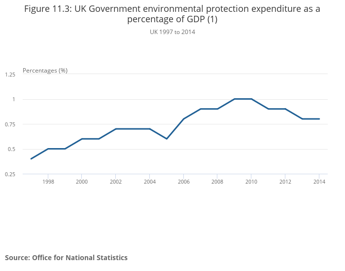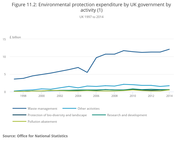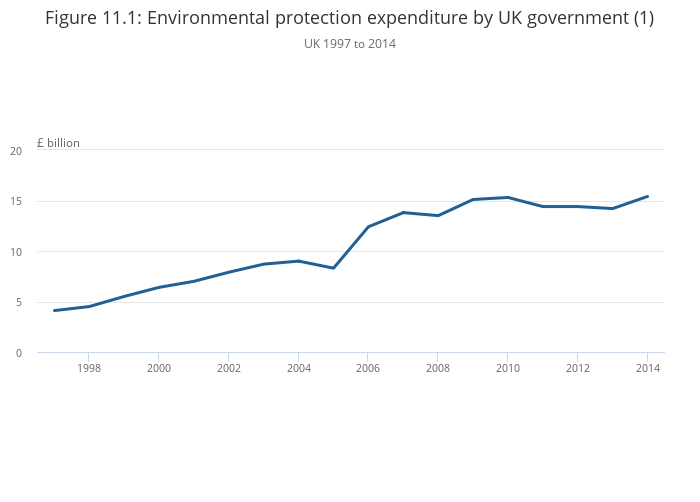 Since 1997, UK government spend on environmental protection expenditure (EPE) has increased from £4.1 billion to £15.4 billion in 2014, and currently accounts for 1.9% of total government spending.