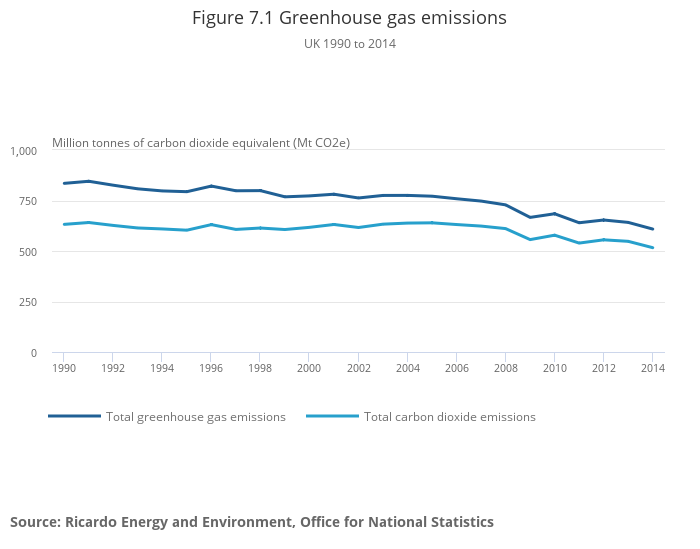 Emissions of greenhouse gases have decreased since 1990; peaking in 1991 at 845.2 million tonnes of carbon dioxide equivalent and falling to 608.6 million tonnes of carbon dioxide equivalent in 2014. This is the lowest level since 1990.