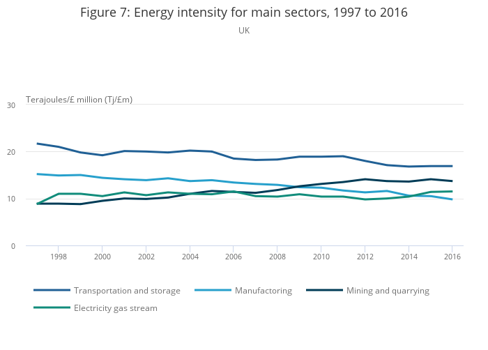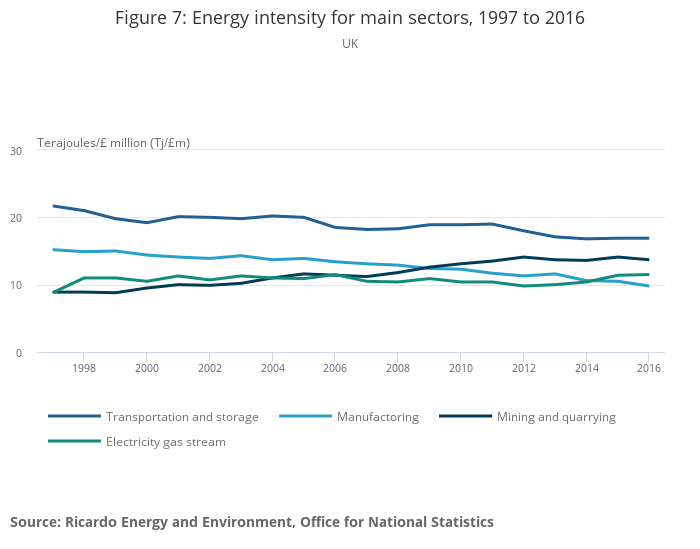 A similar story emerges for the manufacturing sector, where there has been a 74% reduction in coal use and a 96% reduction in fuel oil combustion since 1990. This has helped reduce overall reallocated energy consumption (where losses incurred during transformation2 and distribution3 are allocated to the final consumer) of the manufacturing sector fall to 40 million tonnes of oil equivalent, 38% below 1990 levels.. More recent reductions in the manufacturing sector have been a result of reduced activity in iron and steel and associated industries.