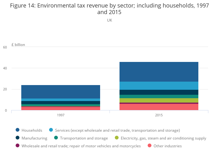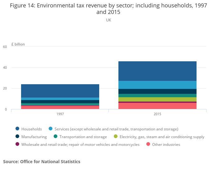 In 2018, two additional taxes – Vehicle Registration Tax and Air Travel Operators Tax – have been classified as environmental taxes, therefore increasing total revenue from environmental taxes across the time series. Table 6 shows this year’s revisions, reflecting differences between estimates published in UK Environmental Accounts, 2017 and 2018.