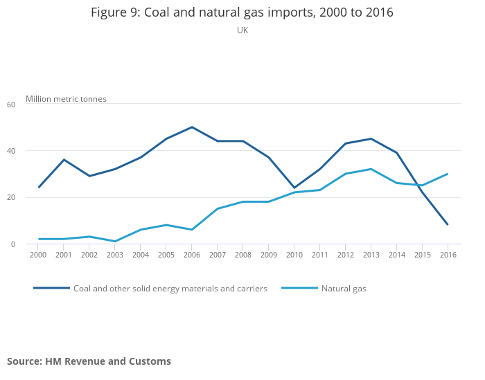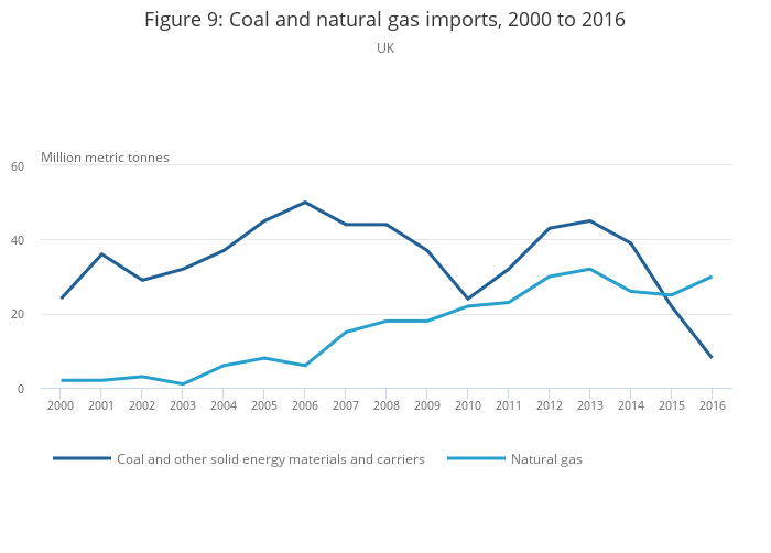 Image .csv .xlsThese reductions were driven largely by a switch from the use of coal and heavy polluting fuels by the manufacturing and energy supply sectors to other, more efficient, fuels. Between 2015 and 2016 coal use by the energy supply sector fell 59%, to almost 85% below 1990 levels. The move towards natural gas for electricity generation, shown in Figure 4, is likely to have contributed to an overall improvement in energy efficiency of electricity generation, thereby resulting in lower overall energy consumption.