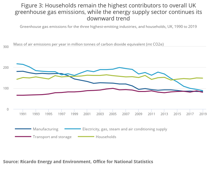 Figure 3: Households remain the highest contributors to overall UK greenhouse gas emissions, while the energy supply sector continues its downward trend