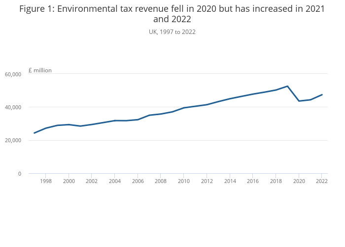 Environmental taxes, using an internationally agreed framework, raised £47.4 billion in the UK in 2022, up 6.9% from £44.3 billion in 2021.