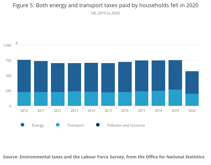 Average environmental taxes paid by households in the UK has dropped from an average of £741 from 2015 to 2019, to £575 in 2020, its lowest level since 1997.