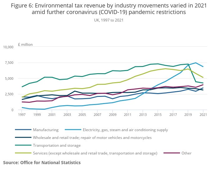 Environmental tax revenue for the transportation and storage industry saw a further decrease in 2021 compared with 2020 of £205 million, with pandemic restrictions remaining in place in that year. Decreases in environmental tax revenue occurred across services industries.