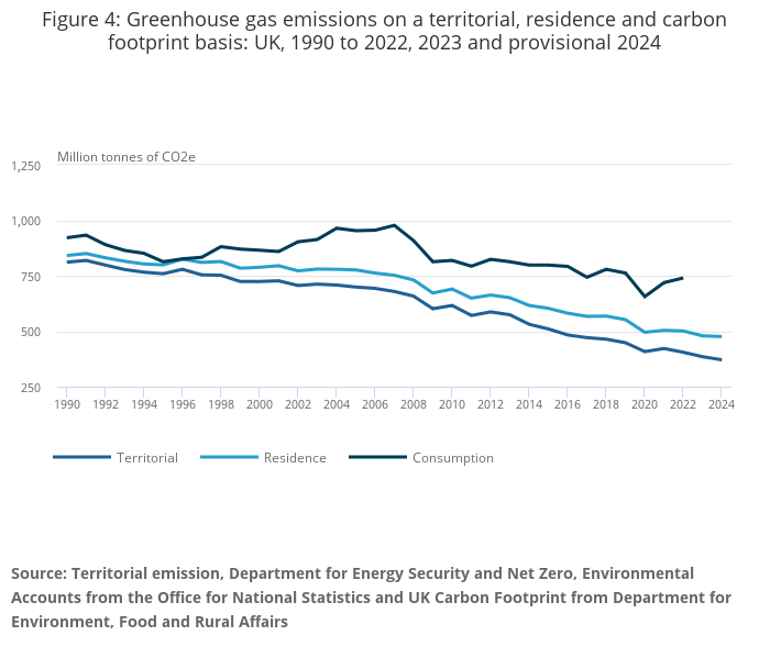 Source: Territorial emission, Department for Energy Security and Net Zero, Environmental Accounts from the Office for National Statistics and UK Carbon Footprint from Department for Environment, Food and Rural Affairs