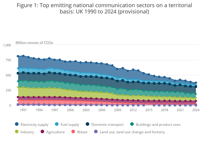 Download this chart Figure 1: Top emitting national communication sectors on a territorial basis: UK 1990 to 2024 (provisional)