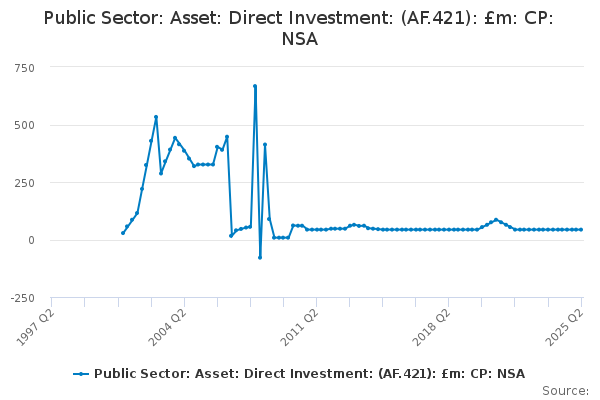 Download this time seriesPublic Sector: Asset: Direct Investment: (AF.421): £m: CP: NSA