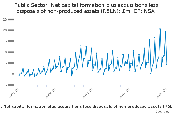 Download this time seriesPublic Sector: Net capital formation plus acquisitions less disposals of non-produced assets (P.5LN): £m: CP: NSA