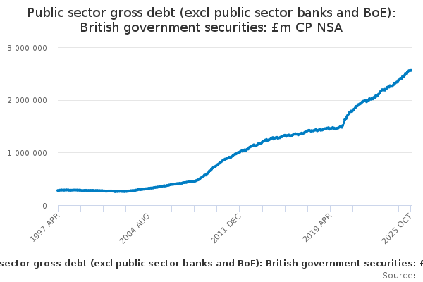 Download this time seriesPublic sector gross debt (excl public sector banks and BoE): British government securities: £m CP NSA