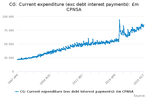 Download this time seriesCG: Current expenditure (exc debt interest payments): £m CPNSA