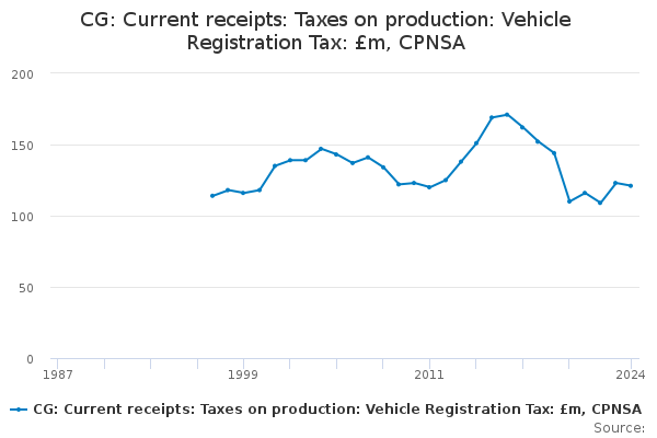 Download this time seriesCG: Current receipts: Taxes on production: Vehicle Registration Tax: £m, CPNSA