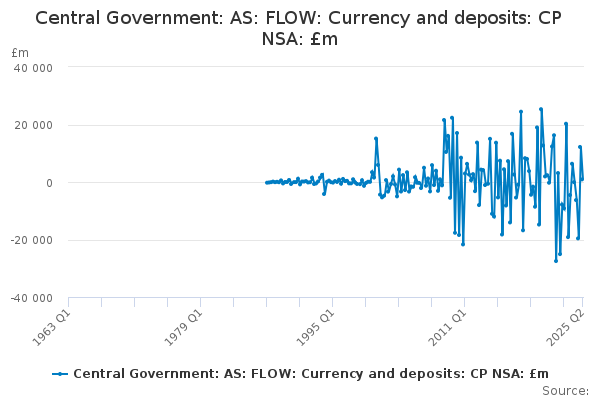 Download this time seriesCentral Government: AS: FLOW: Currency and deposits: CP NSA: £m
