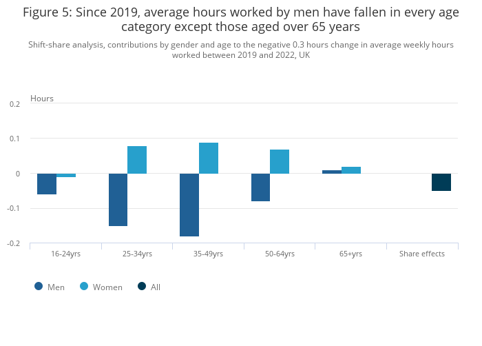 Image .csv .xlsFigure 5 shows the same patterns in the contributions to the 0.3 hours fall in average weekly hours between 2019 and 2022. Men’s average hours fell in every age category except those aged over 65 years. Meanwhile, women’s average hours increased in every category except the 16 to 24 years age group. As before, share effects had a significant negative impact, because of both the increasing proportion of women and older people in total employment.