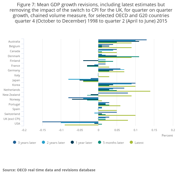 Our article showed that GDP revisions remain small and unbiased over the initial Blue Book revisions periods, and noted the July 2015 comments by the OECD that “France, Italy, Norway and the United Kingdom record the lowest mean revisions for both quarter on quarter and year on year growth rates”. However, our article also acknowledged the perception that the UK has seen more upward revisions beyond the typical 5-year revisions analysis period than many other countries, in part due to the move in 2011 from using the Retail Price Indices (RPI) to using the Consumer Price Indices (CPI) as the main source for deflation for the expenditure measure of GDP. The article stated that further work was ongoing within ONS, both on international comparisons of GDP revisions and on estimating the impact on the UK revisions performance of the move from using RPI to CPI for deflation.