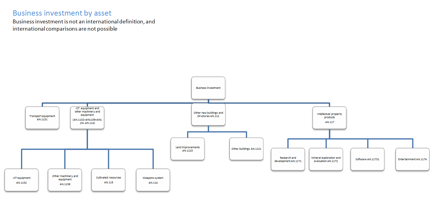 Business investment is net investment by the private sector and public corporations, in transport equipment, information, technology and communications (ICT) equipment, other machinery and equipment, cultivated assets, intellectual property products (IPP, which includes investment in software, research and development, artistic originals and mineral exploration), and buildings and other structures. It does not include investment by central or local government, investment in dwellings or the costs associated with the transfer of non-produced assets (such as land). A full sector and asset hierarchy can be found in the background notes. It should be noted that business investment is not an international concept and therefore it should not be used to make international comparisons.