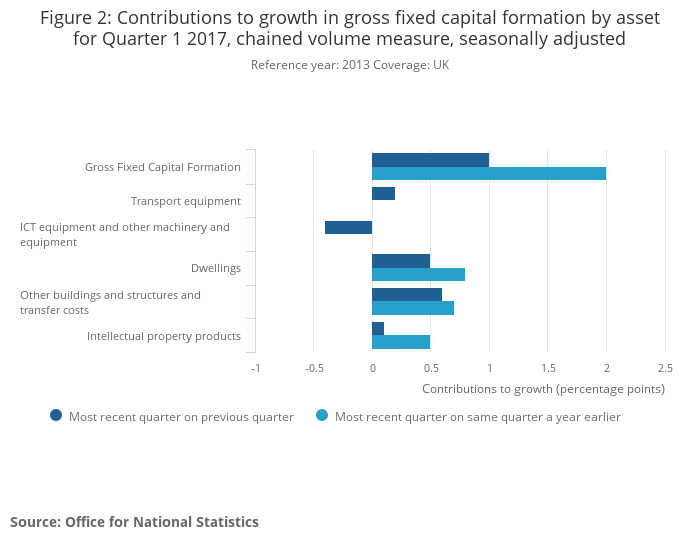 Gross fixed capital formation (GFCF), in volume terms, was estimated to have increased by 1.0% to £78.9 billion in Quarter 1 (Jan to Mar) 2017 from £78.1 billion in Quarter 4 (Oct to Dec) 2016, revised down from the 1.2% increase published in the provisional estimate.