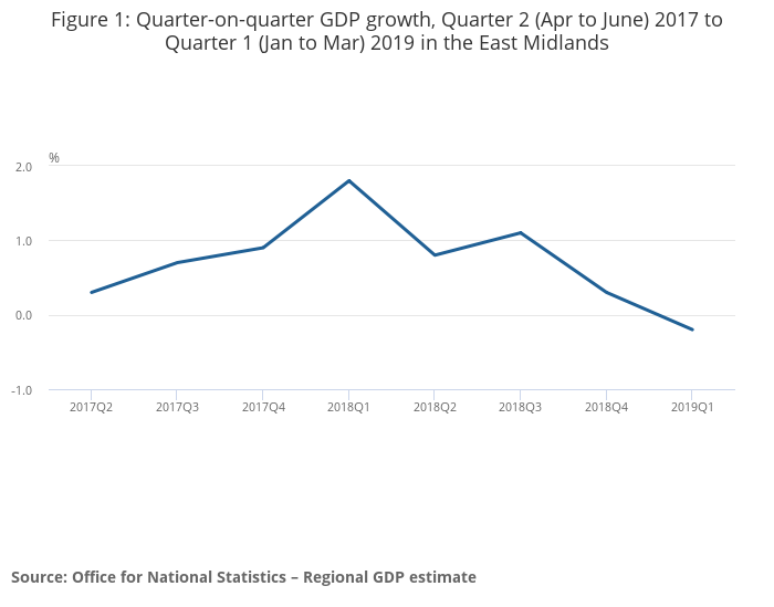 2. GDP growth in the East Midlands was negative 0.2% in Quarter 1 (Jan to Mar) 2019