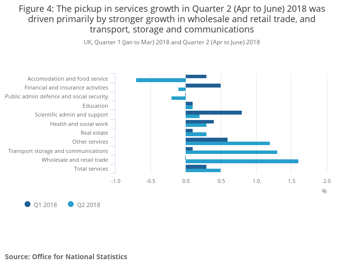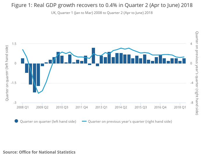 UK gross domestic product (GDP) in volume terms was estimated to have increased by 0.4% between Quarter 1 (Jan to Mar) 2018 and Quarter 2 (Apr to June) 2018.