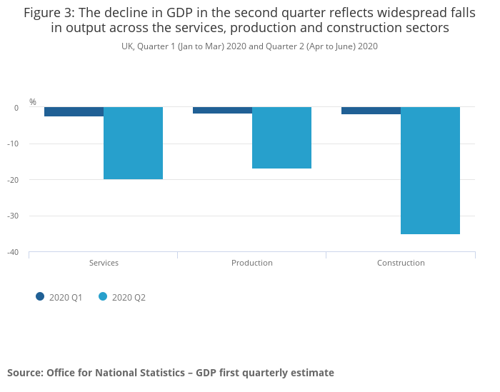 There have been record quarterly falls in services, production and construction output in Quarter 2 (Apr to June) 2020, which have been particularly prevalent in those industries that have been most exposed to the restrictions imposed because of the coronavirus (COVID-19) pandemic. Services output decreased by 19.9% in Quarter 2 2020, while production output fell by 16.9%, and construction output contracted by 35.0% (Figure 3).