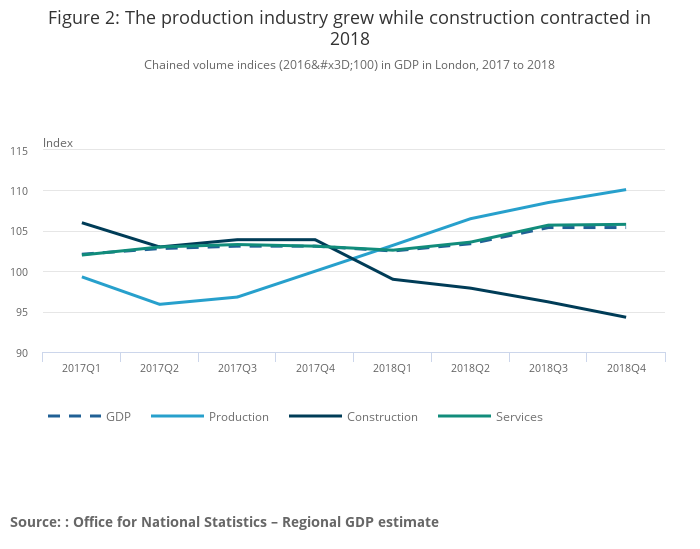 Relative to 2016, London has experienced strong growth in production, showing the strongest increase of all the sectors. However, this is in part a recovery from a fall in output in production in Quarter 2 (Apr to Jun). The services sector has seen growth through 2017 and 2018, while construction continues to fall relative to 2016.