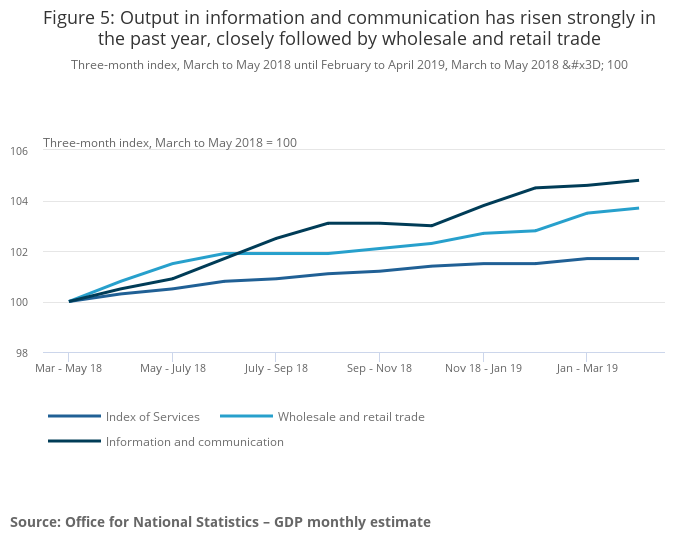 Month-on-month growth in the services sector was flat in April 2019. There was a large positive growth in information and communication in this month, however, this was in part offset by a contraction in professional, scientific and technical activities.