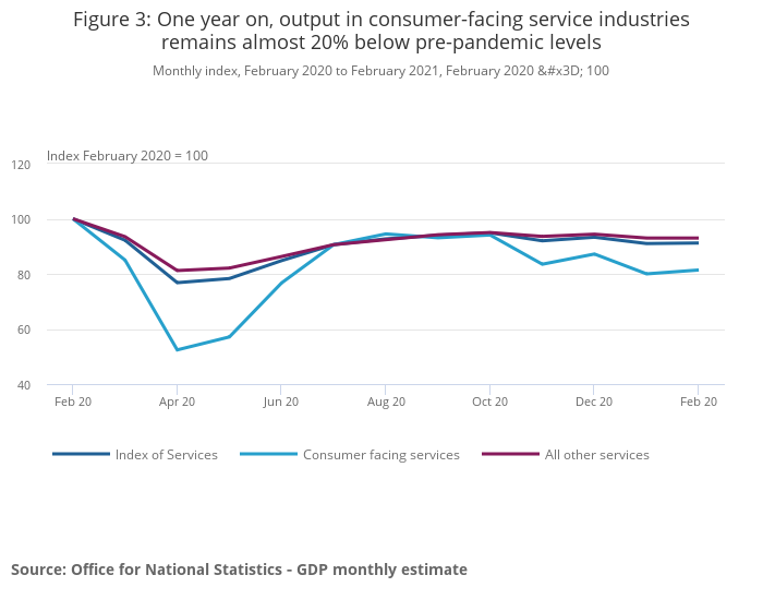 Figure 3: One year on, output in consumer-facing service industries remains almost 20% below pre-pandemic levels