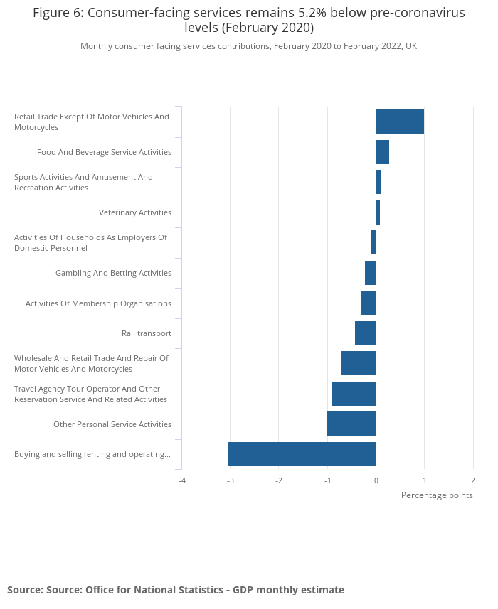 Consumer-facing services were 5.2% below their pre-coronavirus levels (February 2020) in February 2022, while all other services were 4.0% above.