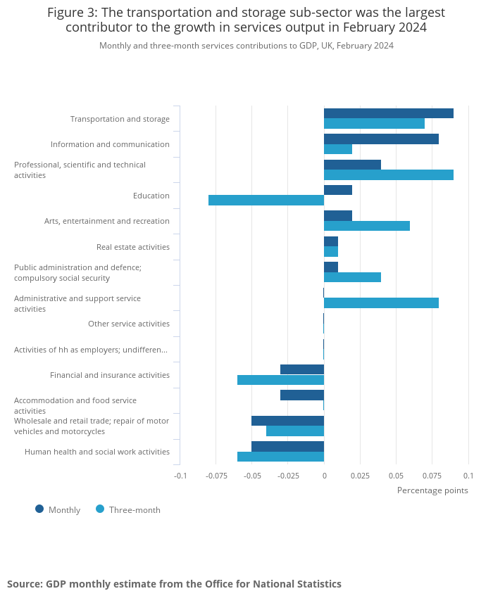 Professional, scientific and technical activities was the largest positive contributor to the rise in services output in this three-month period, growing by 1.1% in the three months to February 2024. The next largest contributions came from admin and support service activities, which grew by 1.6% and transportation and storage, with output here rising by 2.2%.