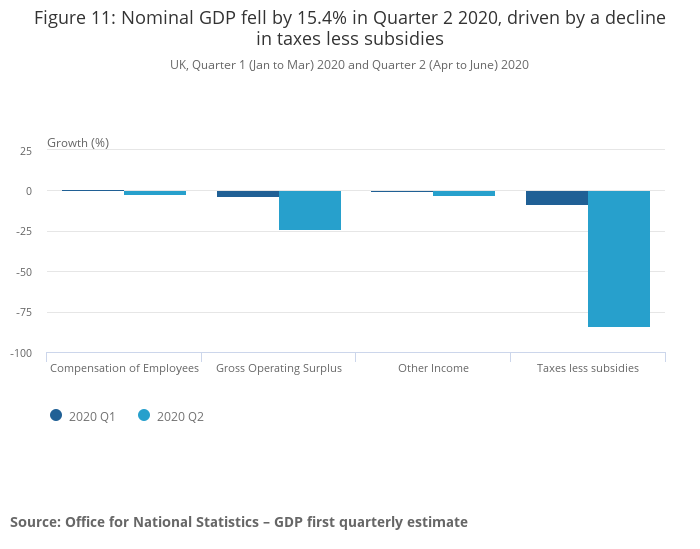 Image .csv .xlsNominal gross domestic product (GDP) fell by a record 15.4% in Quarter 2 (Apr to June) 2020, following a fall of 1.2% in the previous quarter. Taxes less subsidies fell by 83.7% in Quarter 2 2020, reflecting a decline in tax revenue and an increase in subsidies. The increase in subsidies primarily relates to the Coronavirus Job Retention Scheme (CJRS) and Self Employment Income Support Scheme (SEISS) and incorporate estimates from the updated OBR coronavirus reference scenario published on 14 July 2020.