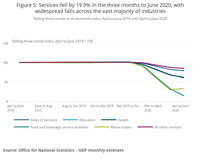 - The services sector fell by 19.9% in Quarter 2 (Apr to June) 2020
