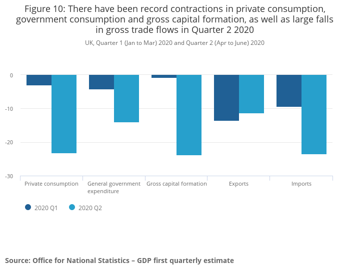 Figure 10: There have been record contractions in private consumption, government consumption and gross capital formation, as well as large falls in gross trade flows in Quarter 2 2020