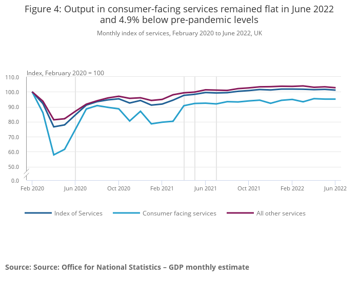 Figure 4: Output in consumer-facing services remained flat in June 2022 and 4.9% below pre-pandemic levels