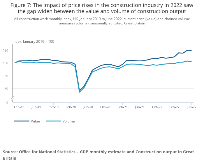 Figure 7: The impact of price rises in the construction industry in 2022 saw the gap widen between the value and volume of construction output